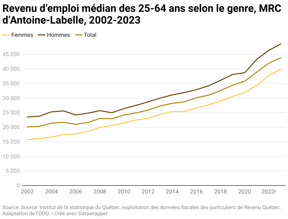Revenu d’emploi médian des 25-64 ans selon le genre, MRC d’Antoine-Labelle, 2002-2023