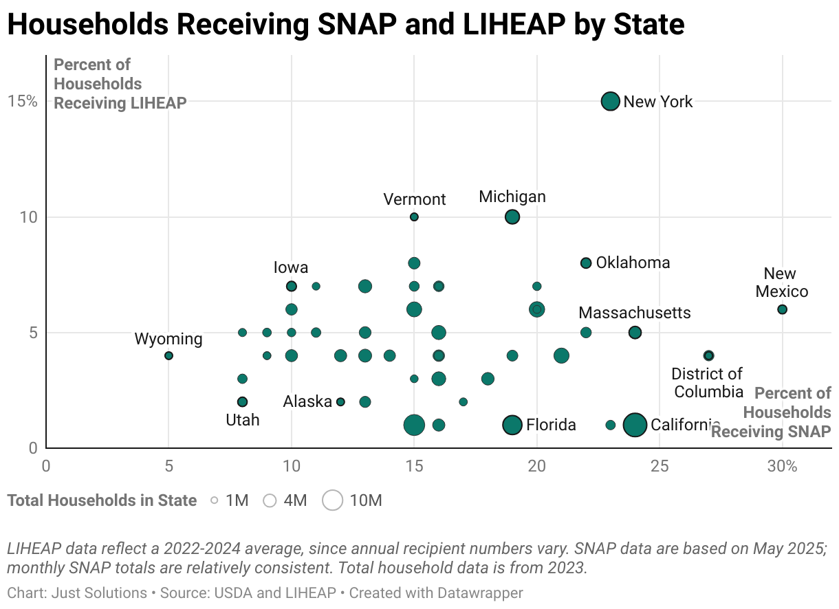 A comparison of the percentage of households receiving SNAP and receiving LIHEAP benefits in each state shows that certain states, such as New York, Michigan, New Mexico, and Oklahoma have a large share of households receiving these benefits.