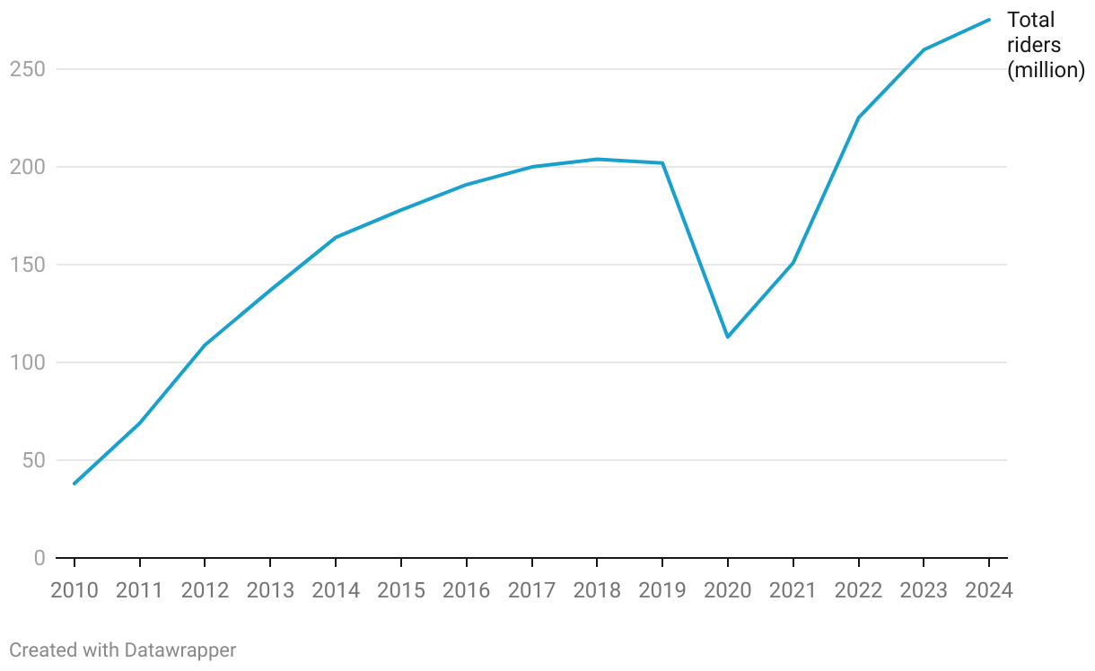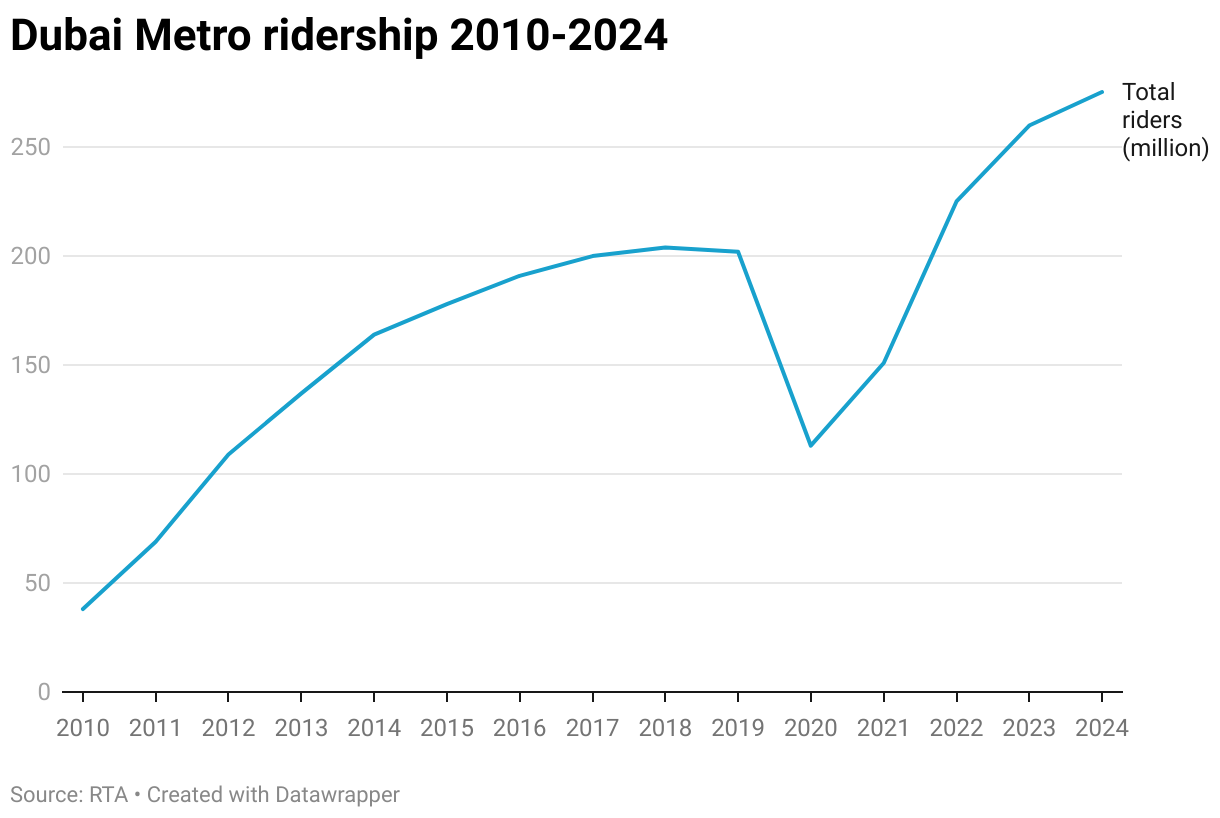 Dubai Metro ridership 2010-2024