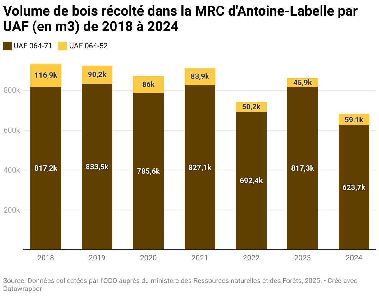 Volume de bois récolté dans la MRC d'Antoine-Labelle par UAF (en m3) de 2018 à 2024