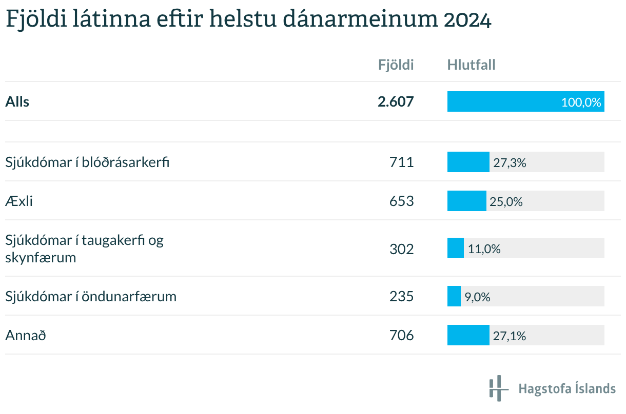 Fjöldi látinna eftir helstu dánarmeinum 2024