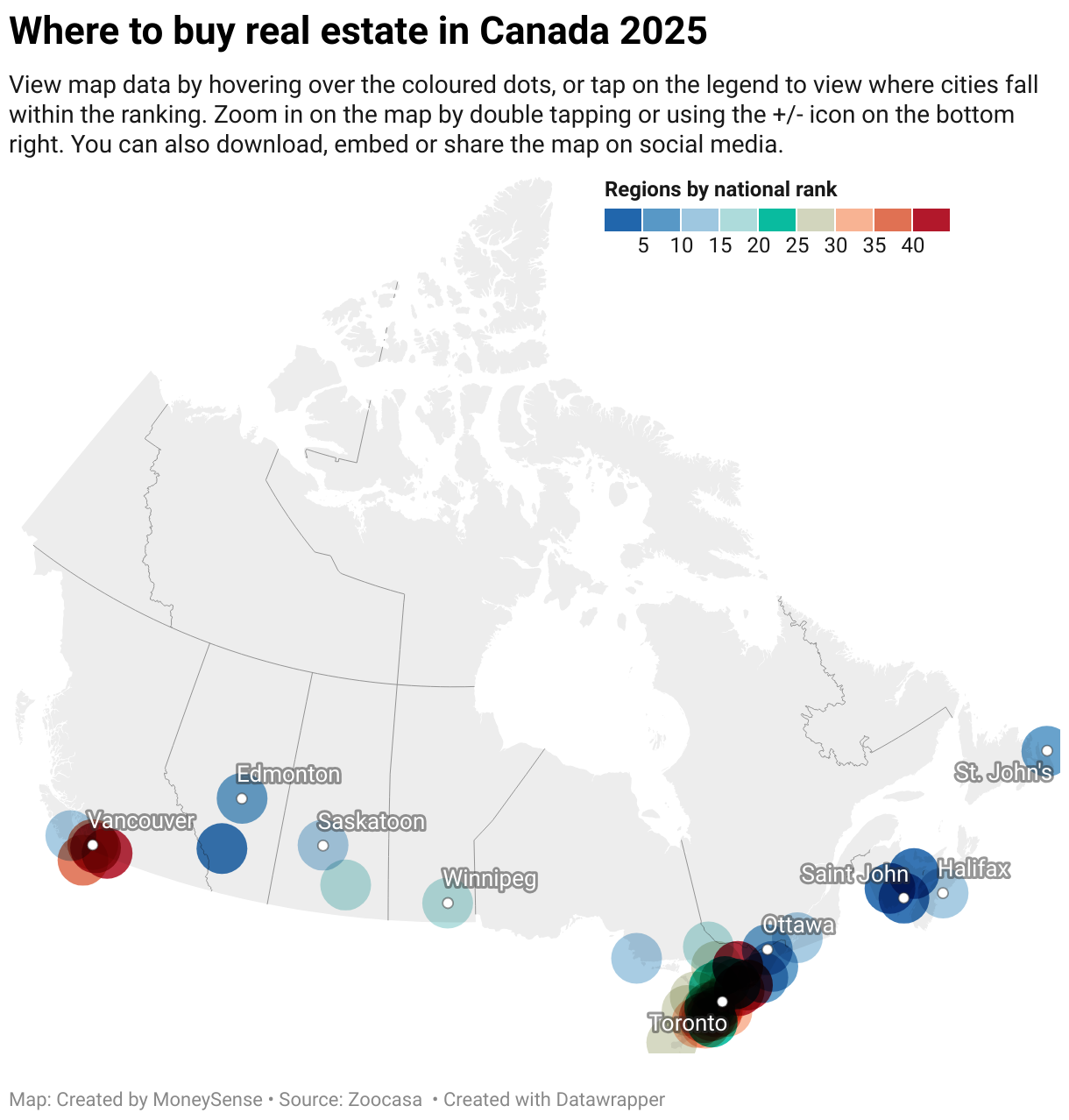 View map data by hovering over the coloured dots, or tap on the legend to view where cities fall within the ranking. Zoom in on the map by double tapping or using the +/- icon on the bottom right. You can also download, embed or share the map on social media.