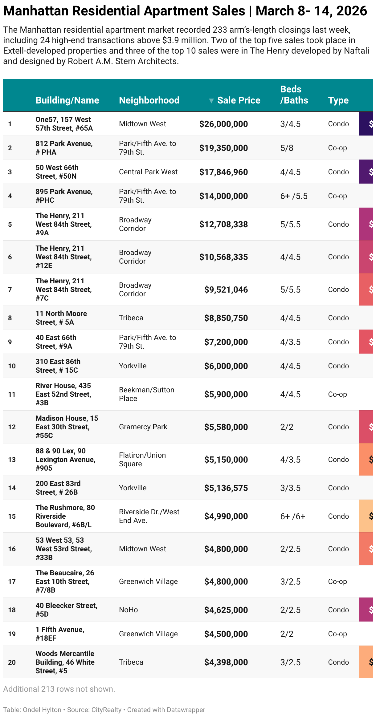 The Manhattan residential apartment market recorded 233 arm’s-length closings last week, including 24 high-end transactions above $3.9 million. Two of the top five sales took place in Extell-developed properties and three of the top 10 sales were in The Henry developed by Naftali and designed by Robert A.M. Stern Architects.