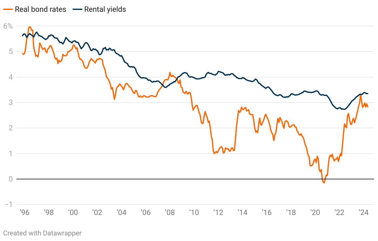 Comparing rental yields against long-erm inflation-adjusted government bond rates