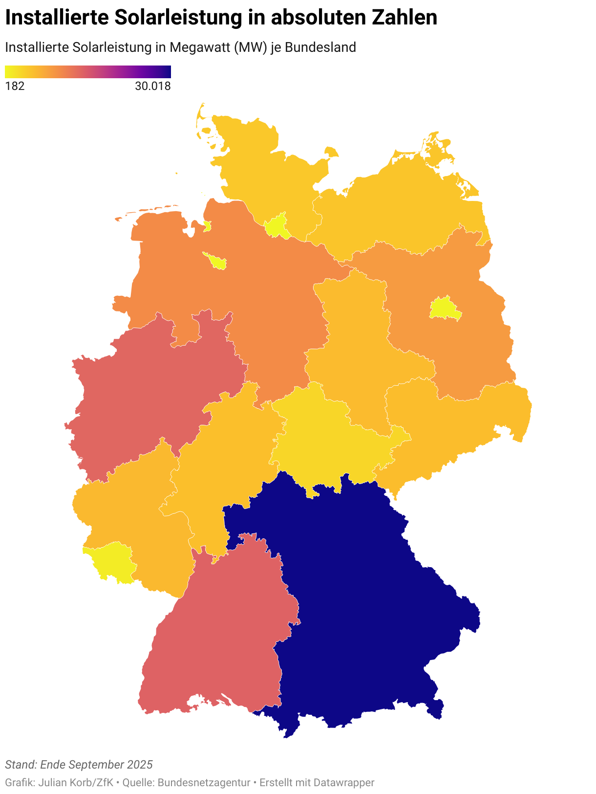 Installierte Solarleistung in Megawatt (MW) je Bundesland