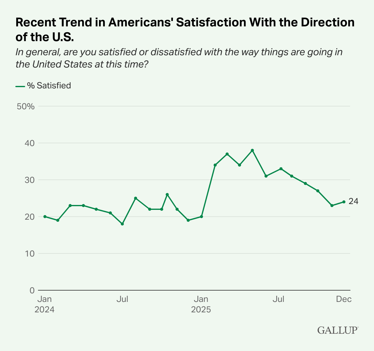 Line graph showing recent trend U.S. adults’ satisfaction with the way things are going, peaking at 38% in May 2025 and dropping to 24% by December 2025.
