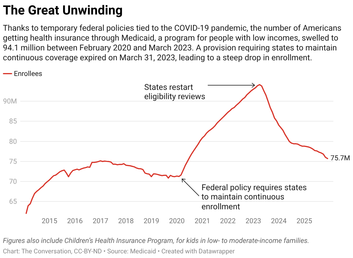 Thanks to temporary federal policies tied to the COVID-19 pandemic, the number of Americans getting health insurance through Medicaid, a program for people with low incomes, swelled to 94.1 million between February 2020 and March 2023. A provision requiring states to maintain continuous coverage expired on March 31, 2023, leading to a steep drop in enrollment.