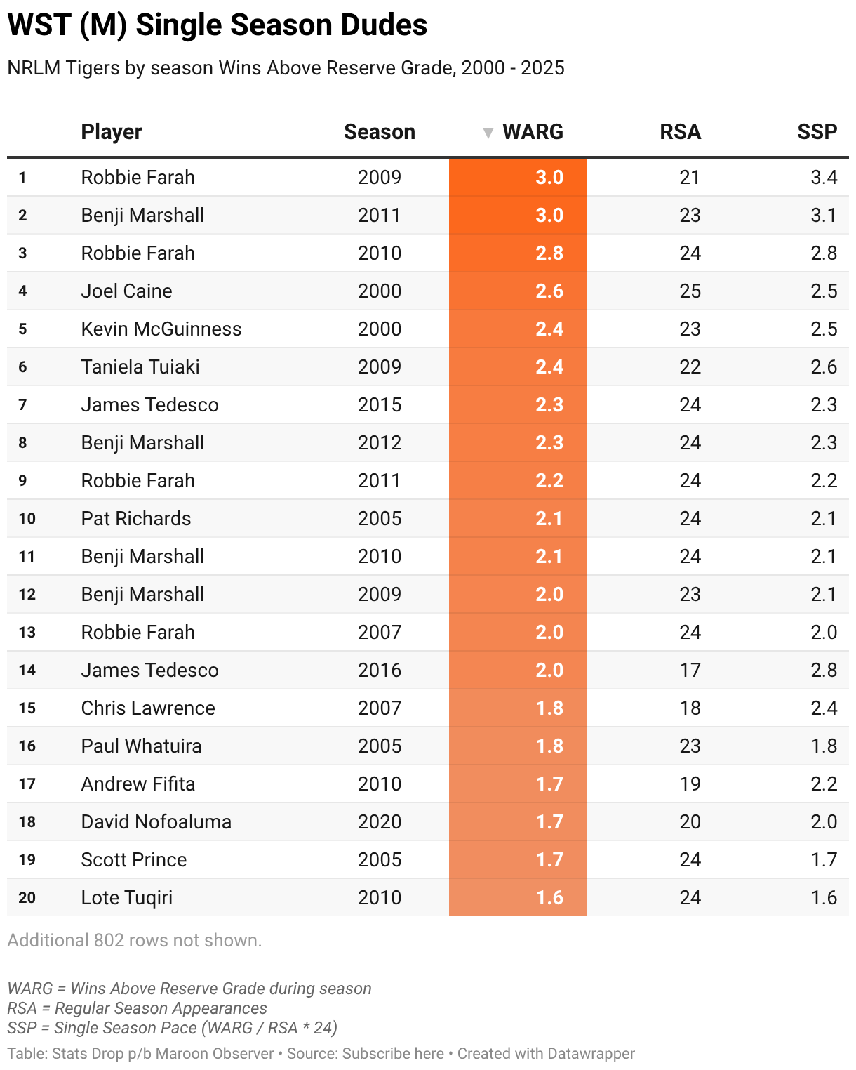 NRLM Tigers by season Wins Above Reserve Grade, 2000 - 2025