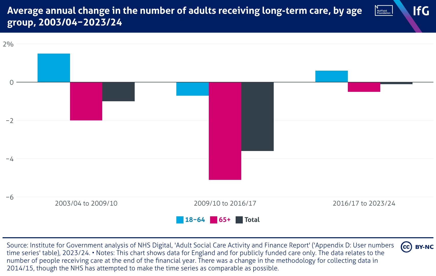 Average annual change in the number of adults receiving long-term care, by age group, 2003/04−2023/24