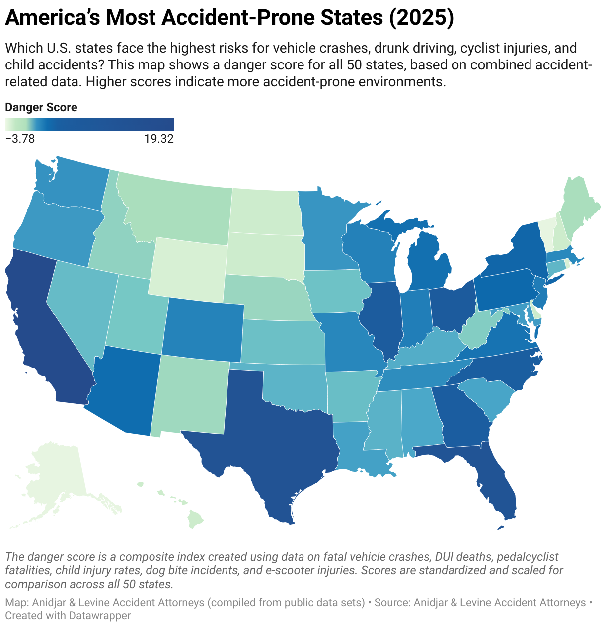 Which U.S. states face the highest risks for vehicle crashes, drunk driving, cyclist injuries, and child accidents? This map shows a danger score for all 50 states, based on combined accident-related data. Higher scores indicate more accident-prone environments.