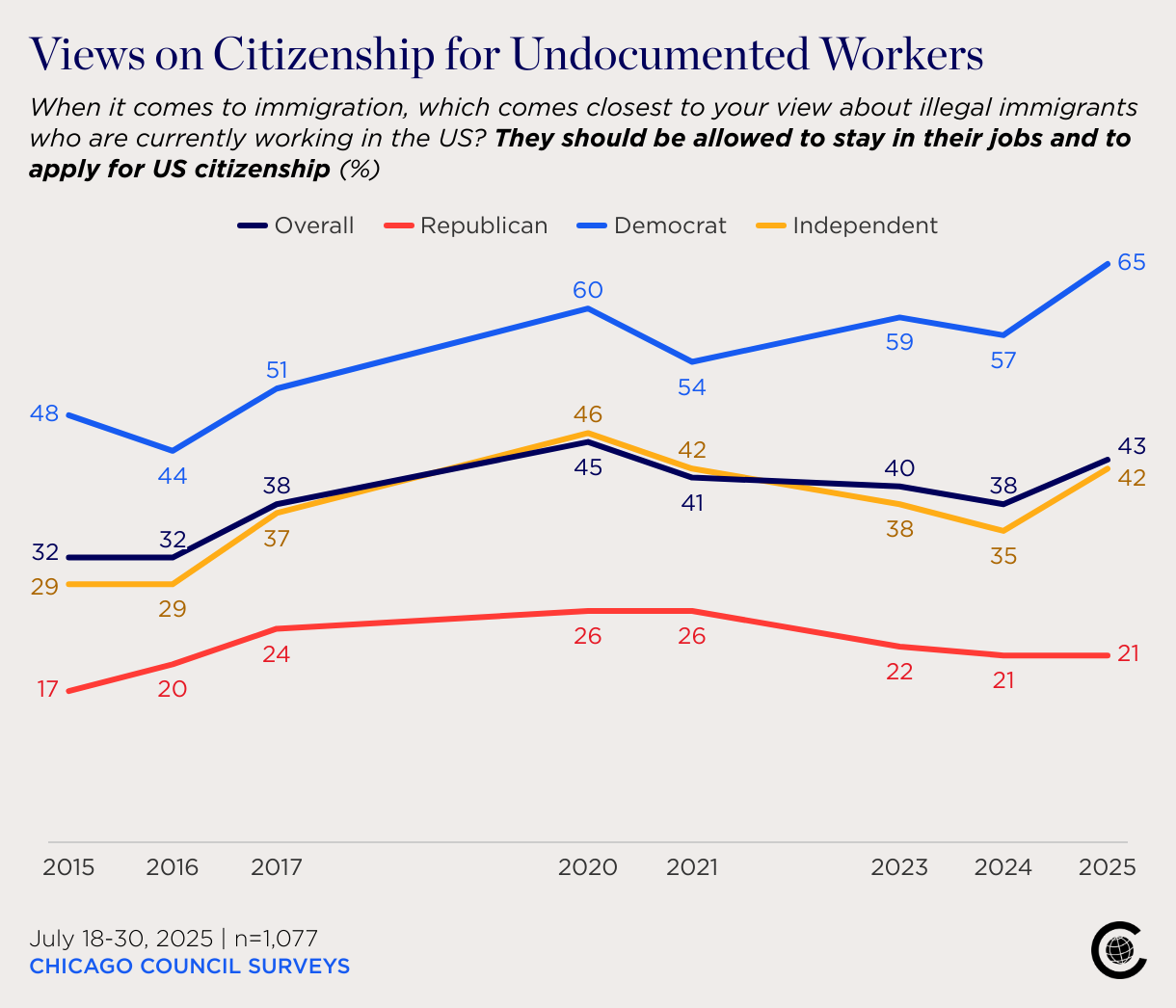 When it comes to immigration, which comes closest to your view about illegal immigrants who are currently working in the US? They should be allowed to stay in their jobs and to apply for US citizenship (%)