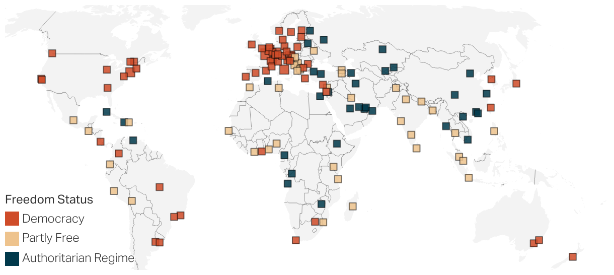 Number of Swiss diplomatic posts worldwide, by country, freedom status* of the country and type of diplomatic post, 2023.