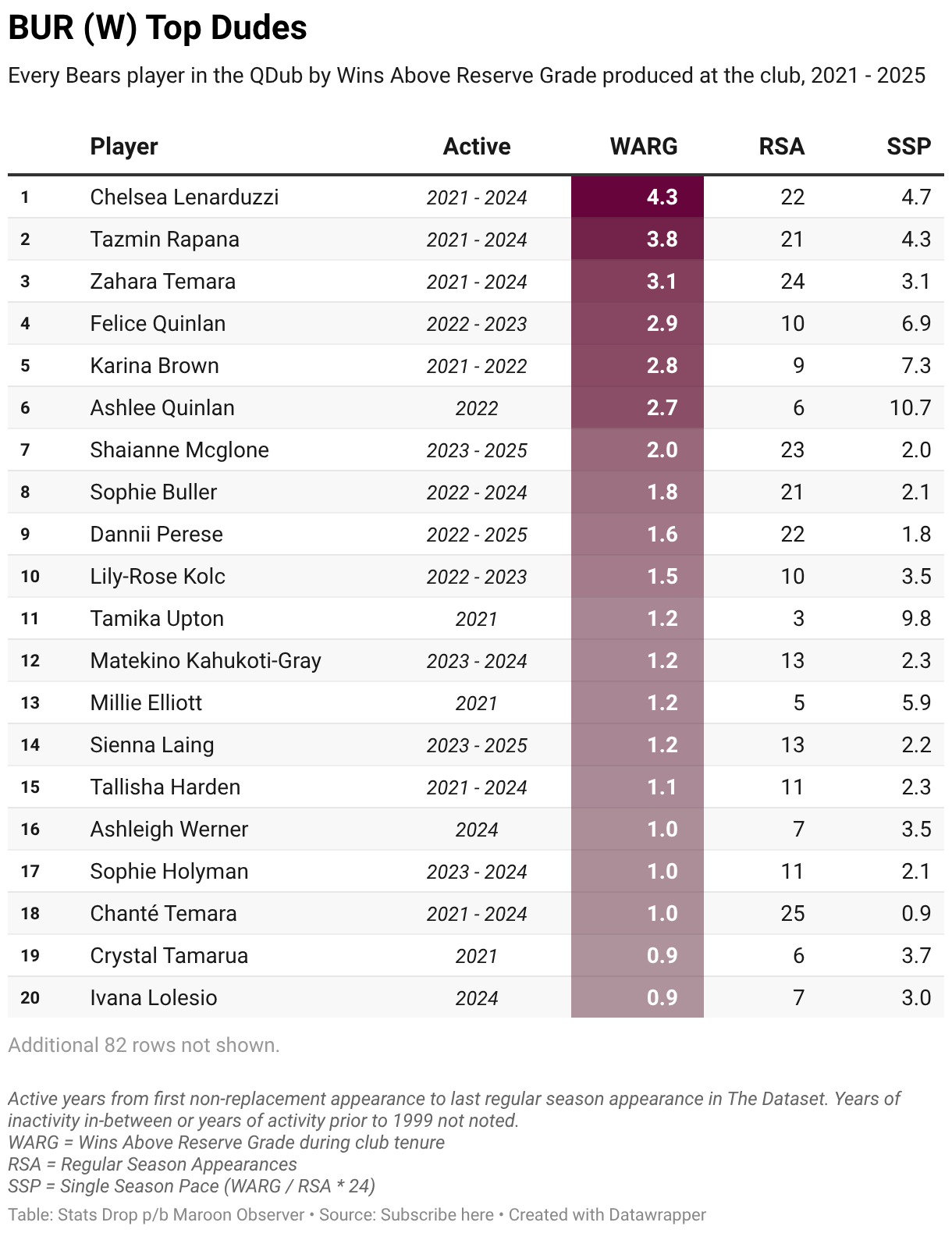 Every Bears player in the QDub by Wins Above Reserve Grade produced at the club, 2021 - 2025
