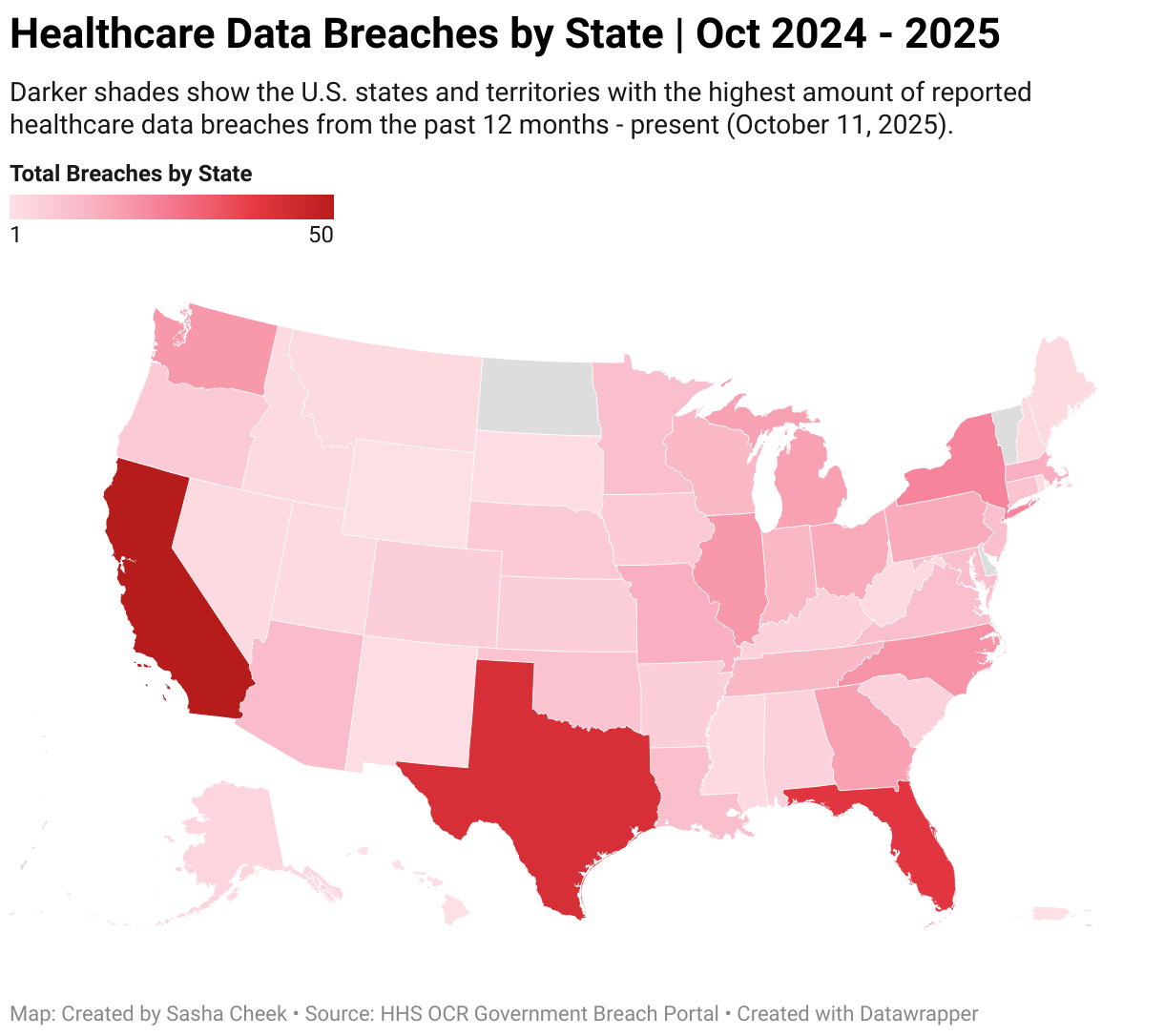 Darker shades show the U.S. states and territories with the highest amount of reported healthcare data breaches from the past 12 months - present (October 11, 2025).