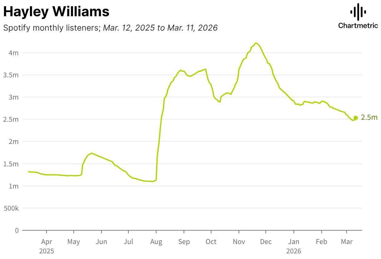 Spotify monthly listeners; Mar. 12, 2025 to Mar. 11, 2026