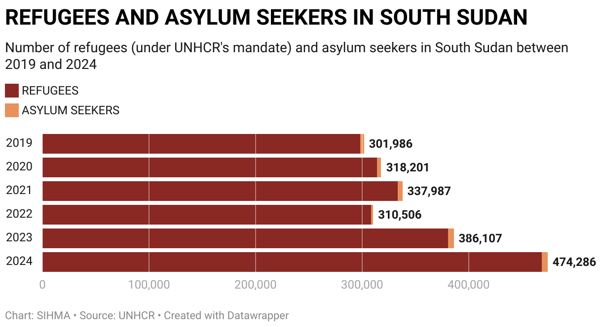 Number of refugees (under UNHCR's mandate) and asylum seekers in South Sudan between 2019 and 2024