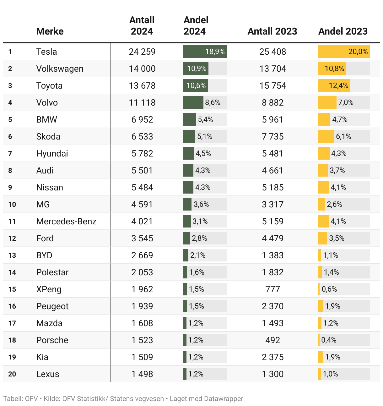 Grafikk: OFVKilde: OFV Statistikk/ Statens vegvesenLast ned dataLast ned bildeLaget med Datawrapper