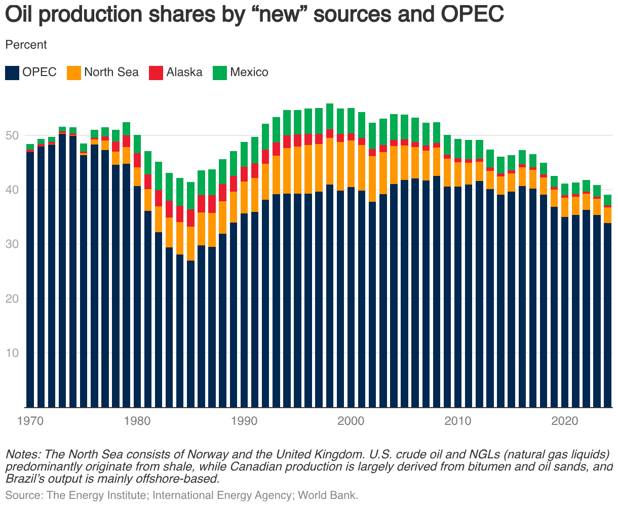 Oil production shares by “new” sources and OPEC