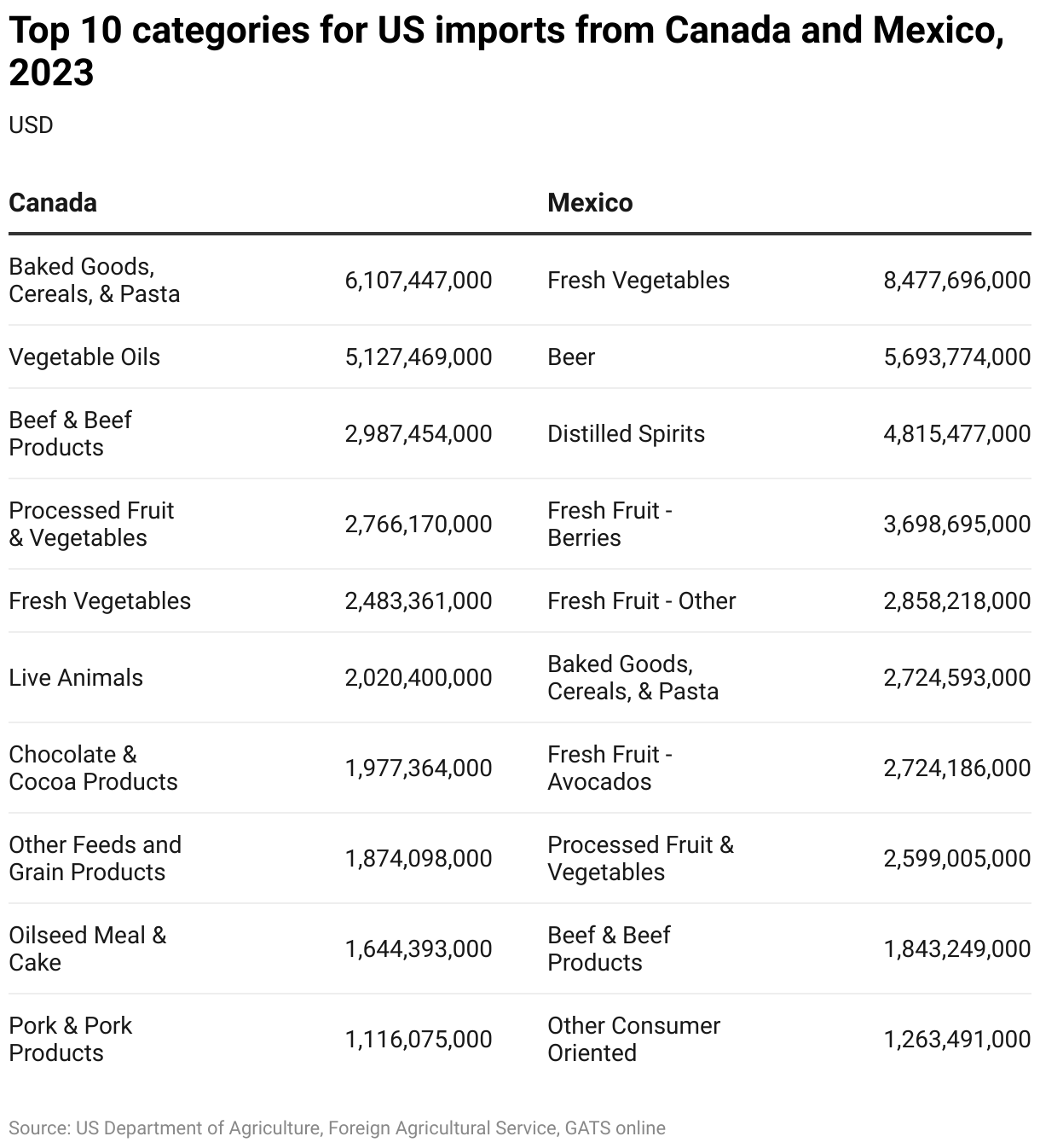 Top 10 categories for US imports from Canada and Mexico, 2023