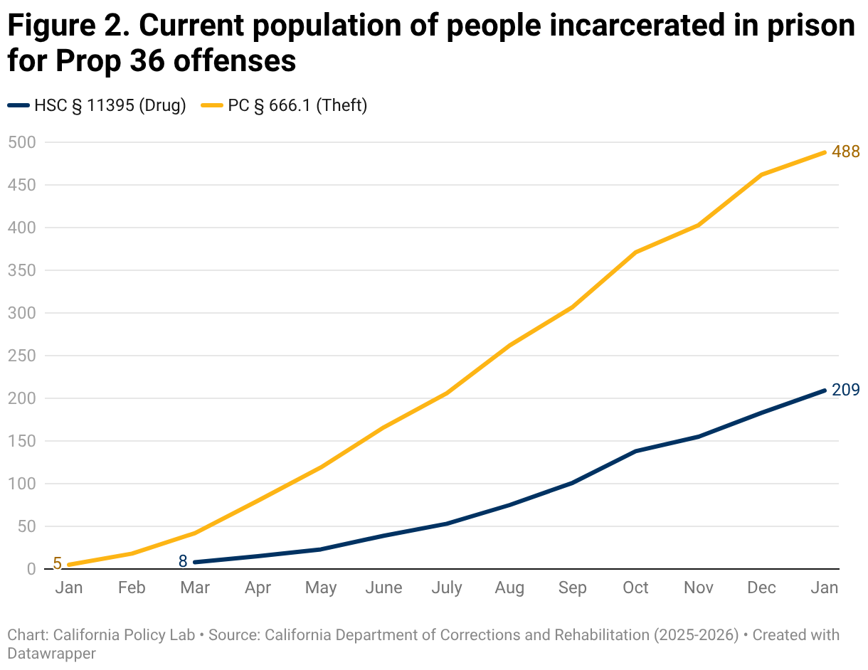 A line graph of the current population of people incarcerated in prison for Prop 36 offenses in California, where the population has steadily increased under both offenses. Under the Treatment-Mandated Drug-Possession Felony offense, 8 people had been admitted as of March 2025, growing to 209 people admitted as of January 2026. Under the Petty Theft with Prior Offense, 5 people had been admitted as of January 2025, growing to 488 people as of January 2026.