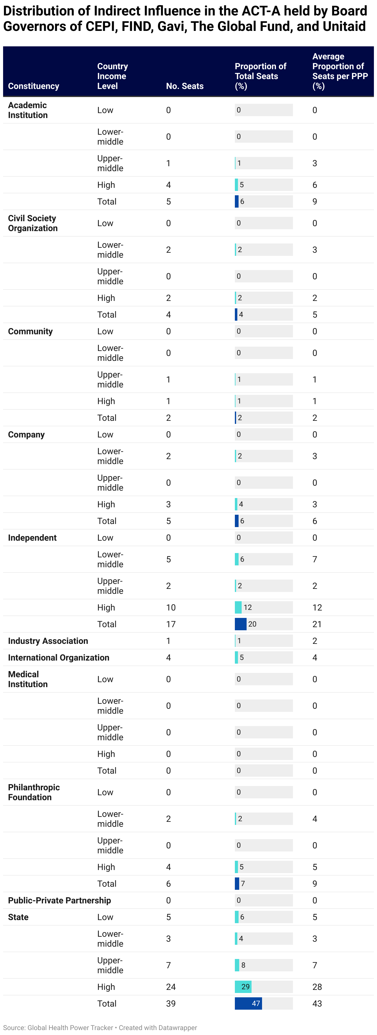 Distribution of Indirect Influence in the ACT-A held by Board Governors of CEPI, FIND, Gavi, The Global Fund, and Unitaid