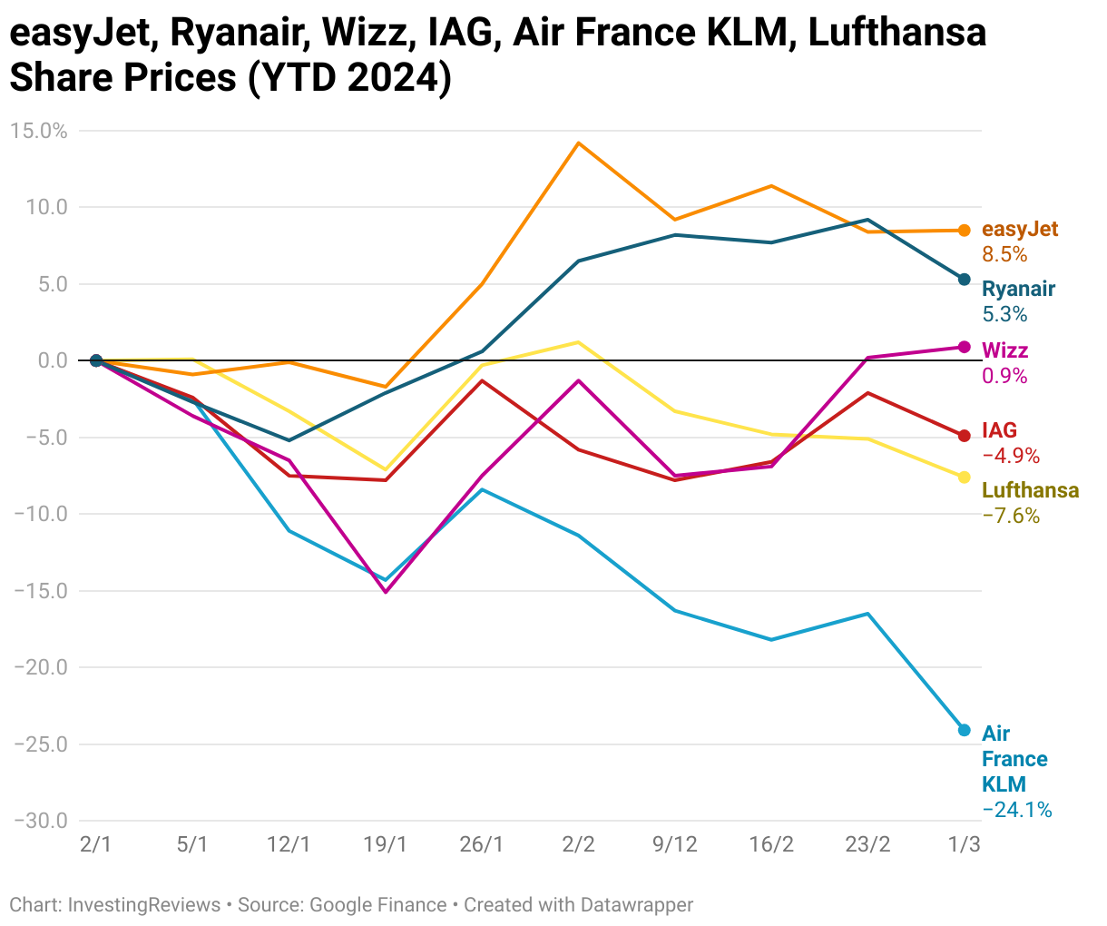 easyJet, Ryanair, Wizz, IAG, Air France KLM, Lufthansa Share Prices (YTD 2024)