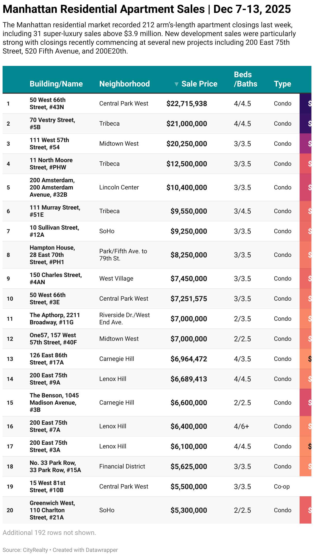 The Manhattan residential market recorded 212 arm’s-length apartment closings last week, including 31 super-luxury sales above $3.9 million. New development sales were particularly strong with closings recently commencing at several new projects including 200 East 75th Street, 520 Fifth Avenue, and 200E20th.