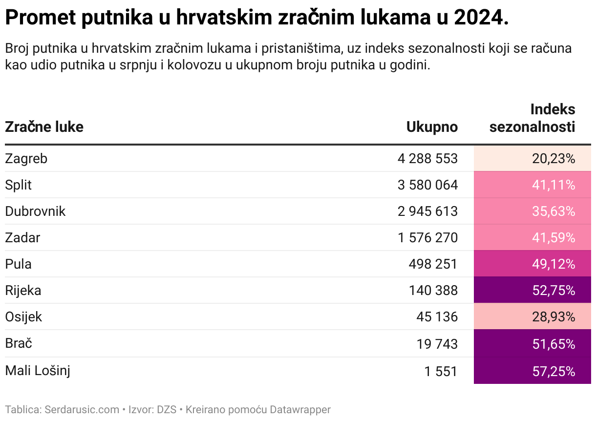 Broj putnika u hrvatskim zračnim lukama i pristaništima, uz indeks sezonalnosti koji se računa kao udio putnika u srpnju i kolovozu u ukupnom broju putnika u godini.