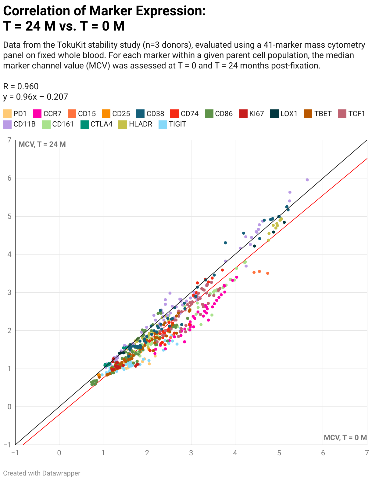 Data from the TokuKit stability study (n=3 donors), evaluated using a 41-marker mass cytometry panel on fixed whole blood. For each marker within a given parent cell population, the median marker channel value (MCV) was assessed at T = 0 and T = 24 months post-fixation.