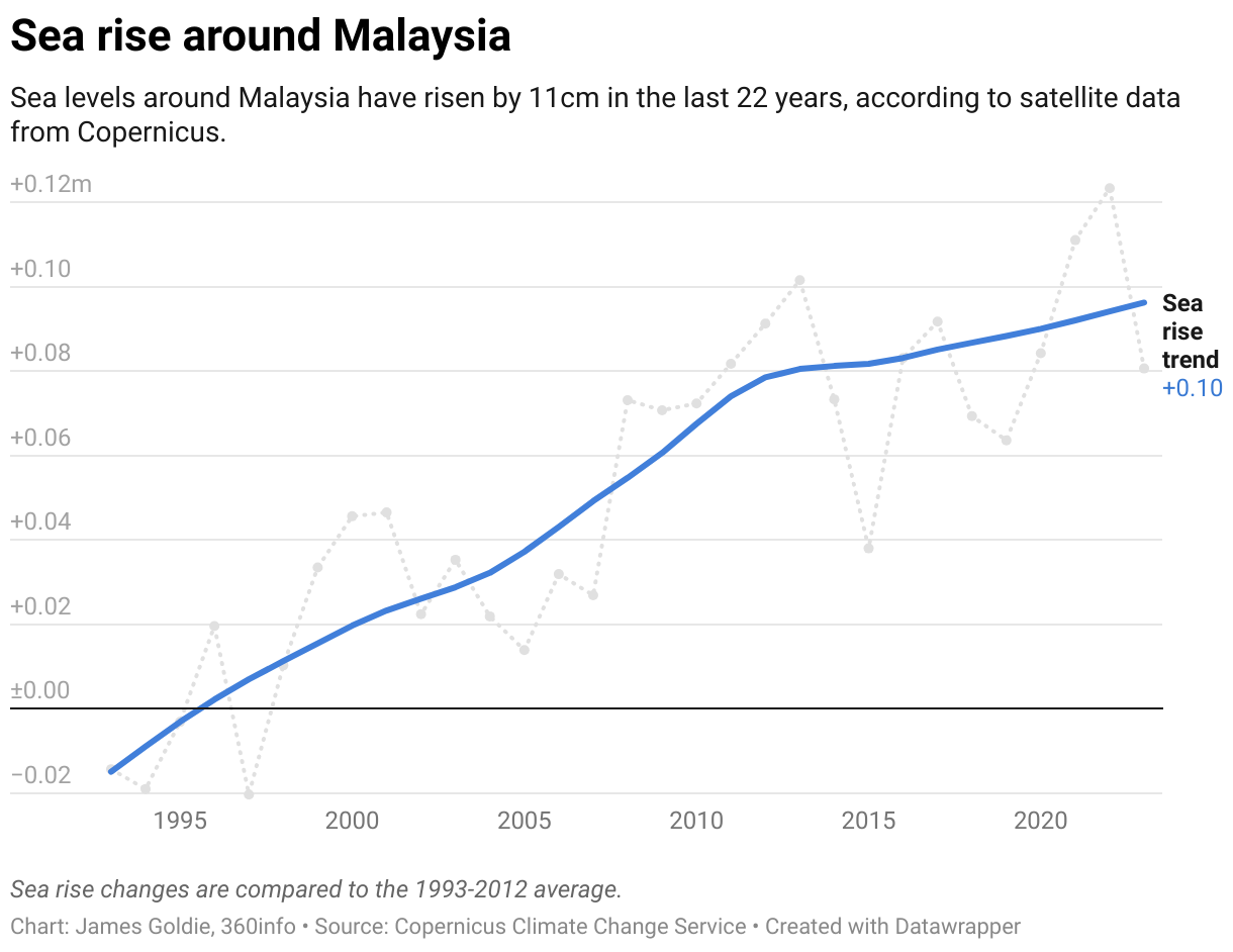 Sea levels around Malaysia have risen by 11cm in the last 22 years, according to satellite data from Copernicus.