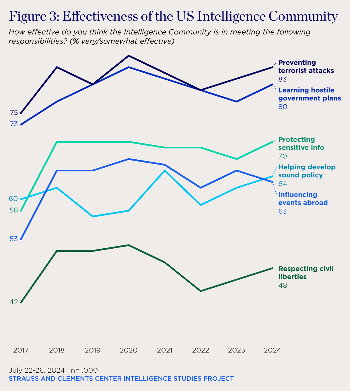 How effective do you think the Intelligence Community is in meeting the following responsibilities? (% very/somewhat effective)