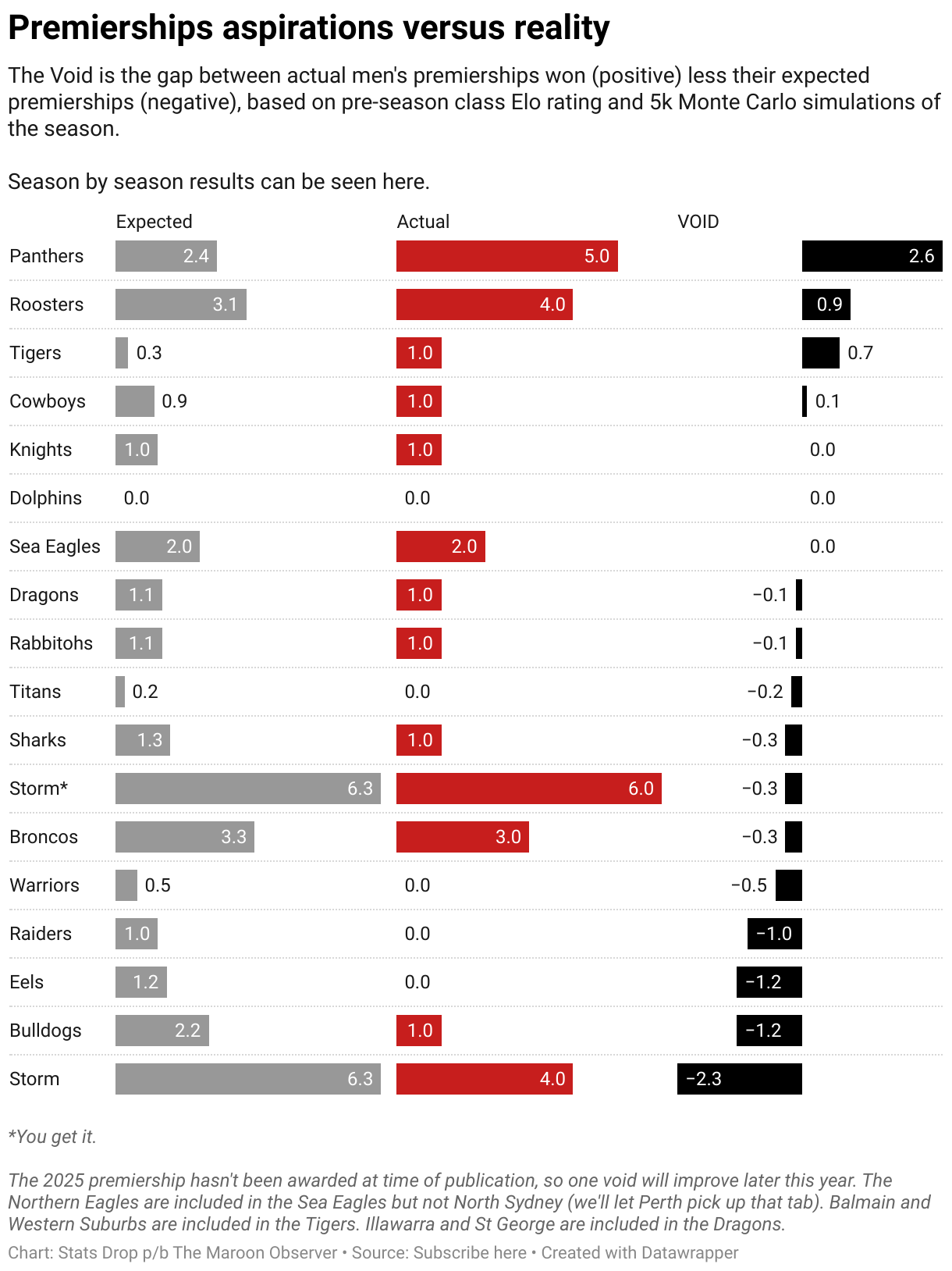 The Void is the gap between actual men's premierships won (positive) less their expected premierships (negative), based on pre-season class Elo rating and 5k Monte Carlo simulations of the season. Season by season results can be seen here.