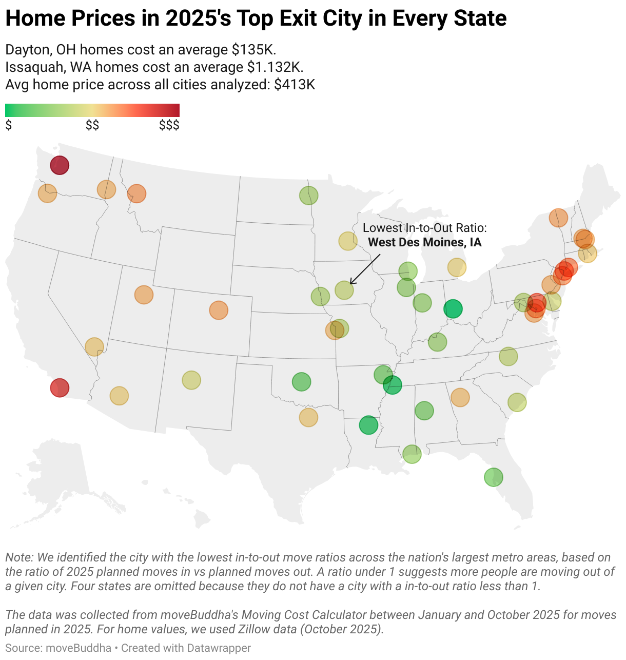 Dayton, OH homes cost an average $135K.Issaquah, WA homes cost an average $1.132K. Avg home price across all cities analyzed: $413K