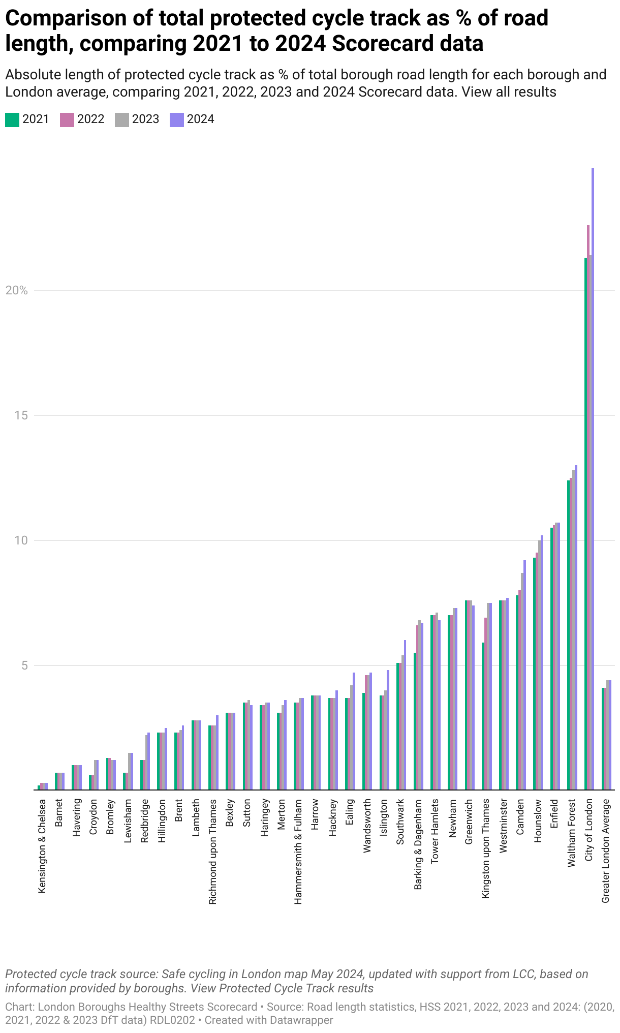 Absolute length of protected cycle track as % of total borough road length for each borough and London average, comparing 2021, 2022, 2023 and 2024 Scorecard data. View all results