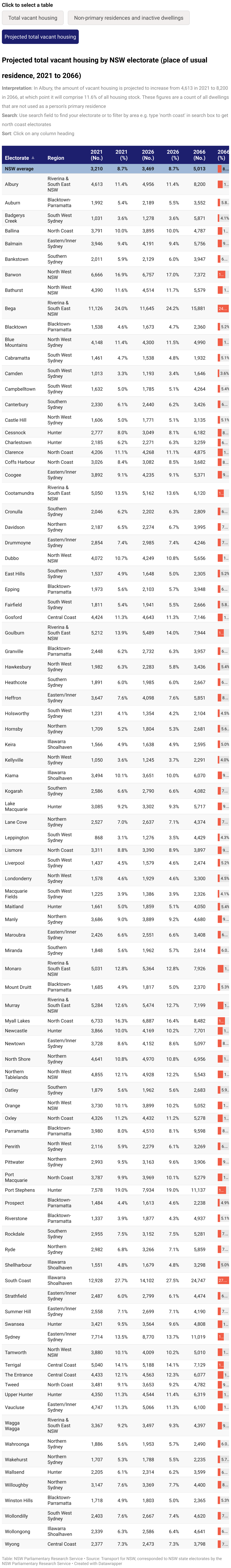 Projected total vacant housing by NSW electorate (place of usual residence, 2021 to 2066)