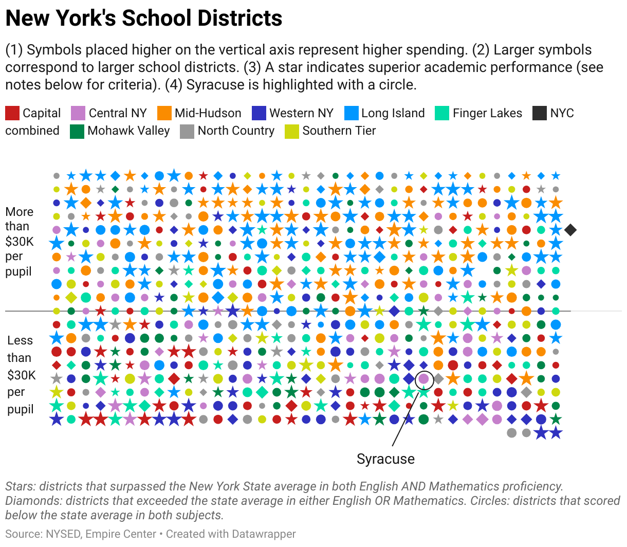 (1) Symbols placed higher on the vertical axis represent higher spending. (2) Larger symbols correspond to larger school districts. (3) A star indicates superior academic performance (see notes below for criteria). (4) Syracuse is highlighted with a circle.