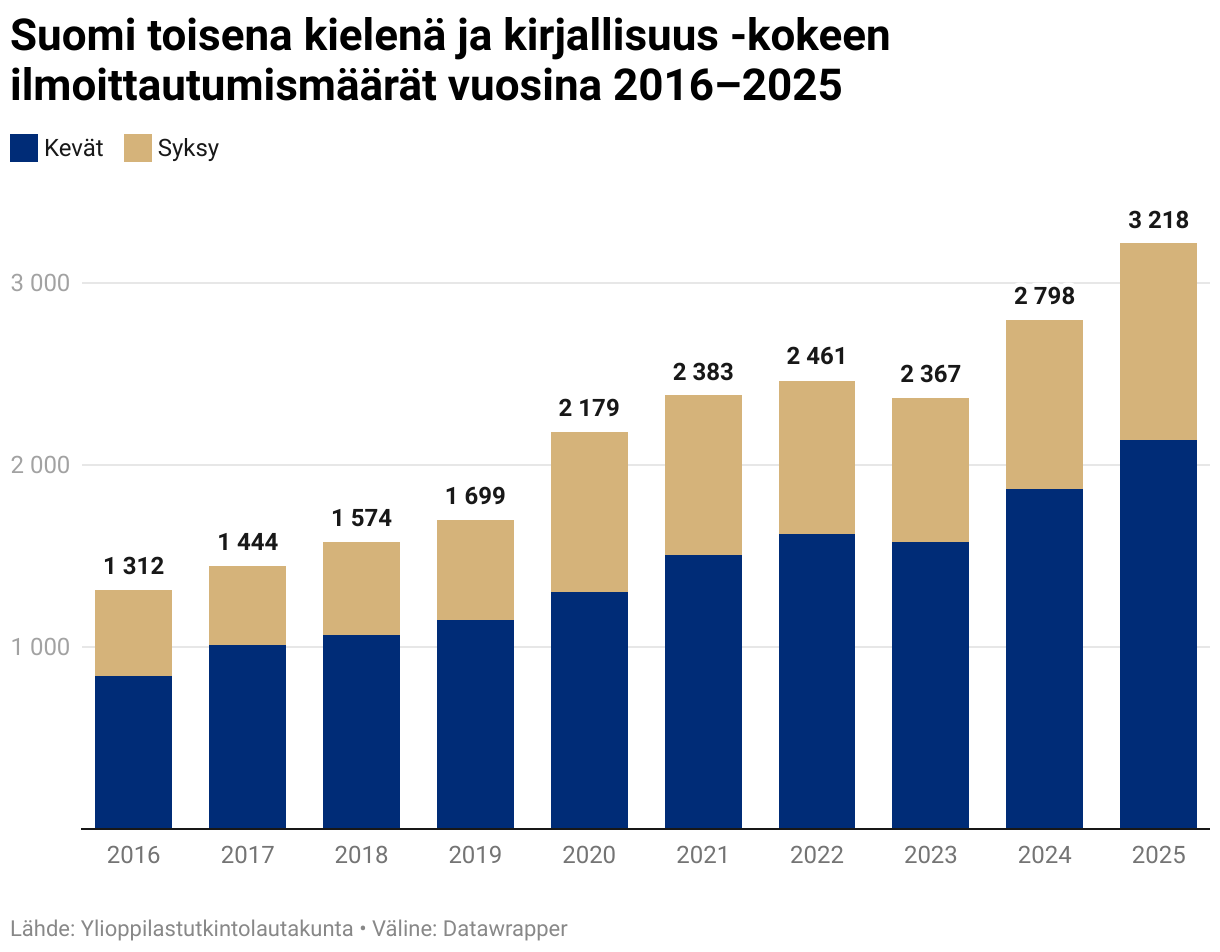 Suomi toisena kielenä ja kirjallisuus -kokeen ilmoittautumismäärät vuosina 2016–2025
