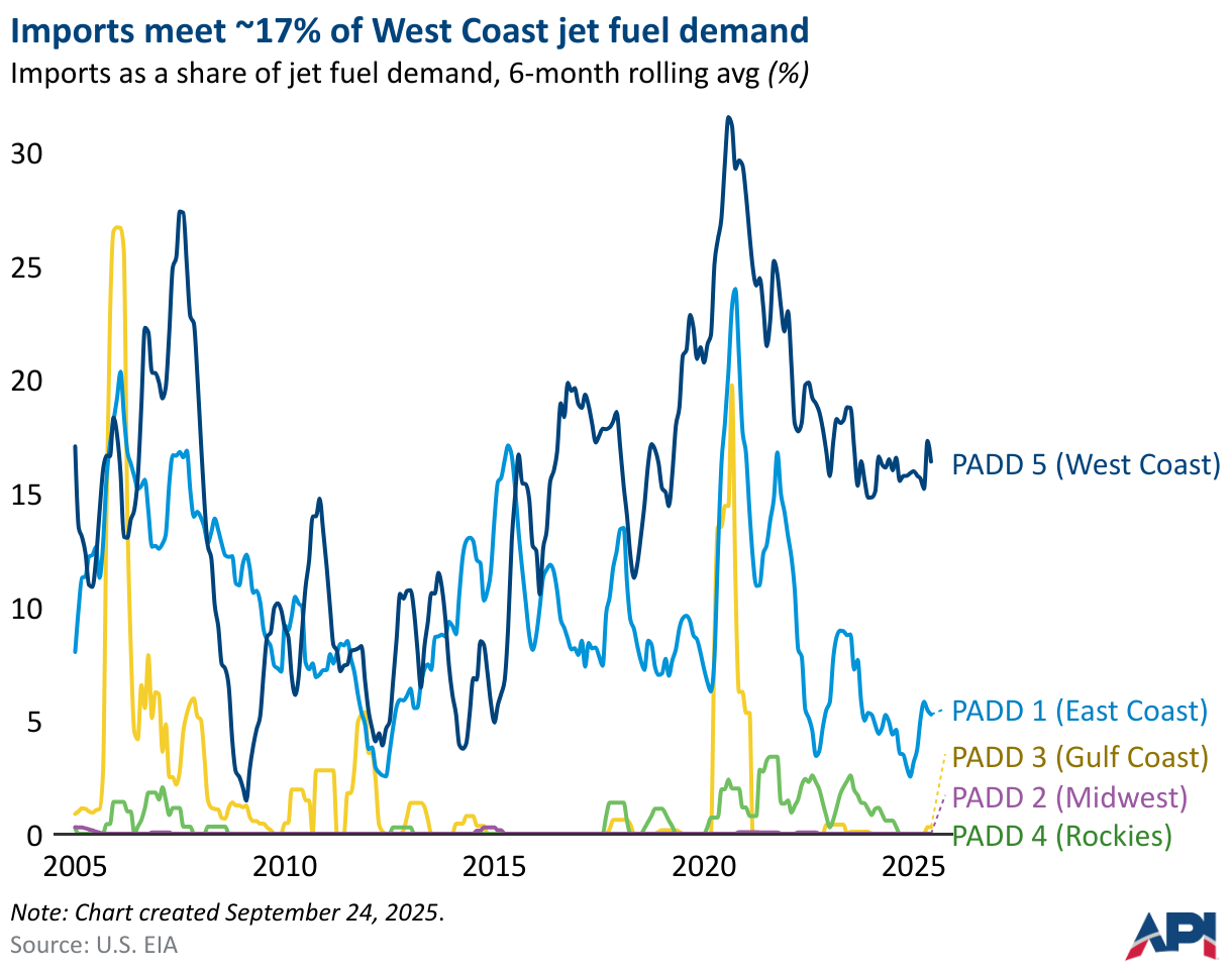 Imports as a share of jet fuel demand, 6-month rolling avg (%)