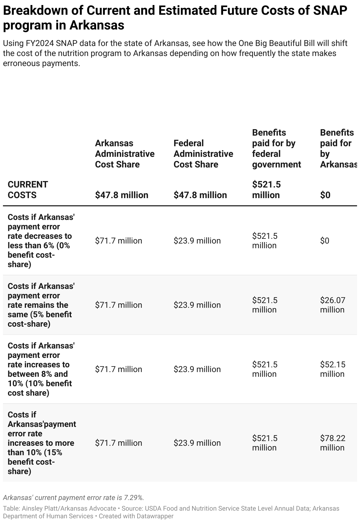 Using FY2024 SNAP data for the state of Arkansas, see how the One Big Beautiful Bill will shift the cost of the nutrition program to Arkansas depending on how frequently the state makes erroneous payments.