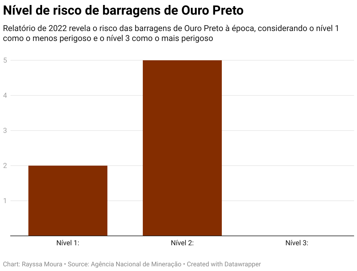 Relatório de 2022 revela o risco das barragens de Ouro Preto à época, considerando o nível 1 como o menos perigoso e o nível 3 como o mais perigoso