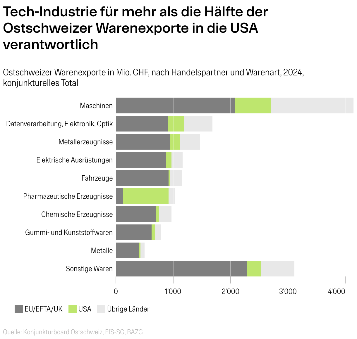 Ostschweizer Warenexporte in Mio. CHF, nach Handelspartner und Warenart, 2024, konjunkturelles Total