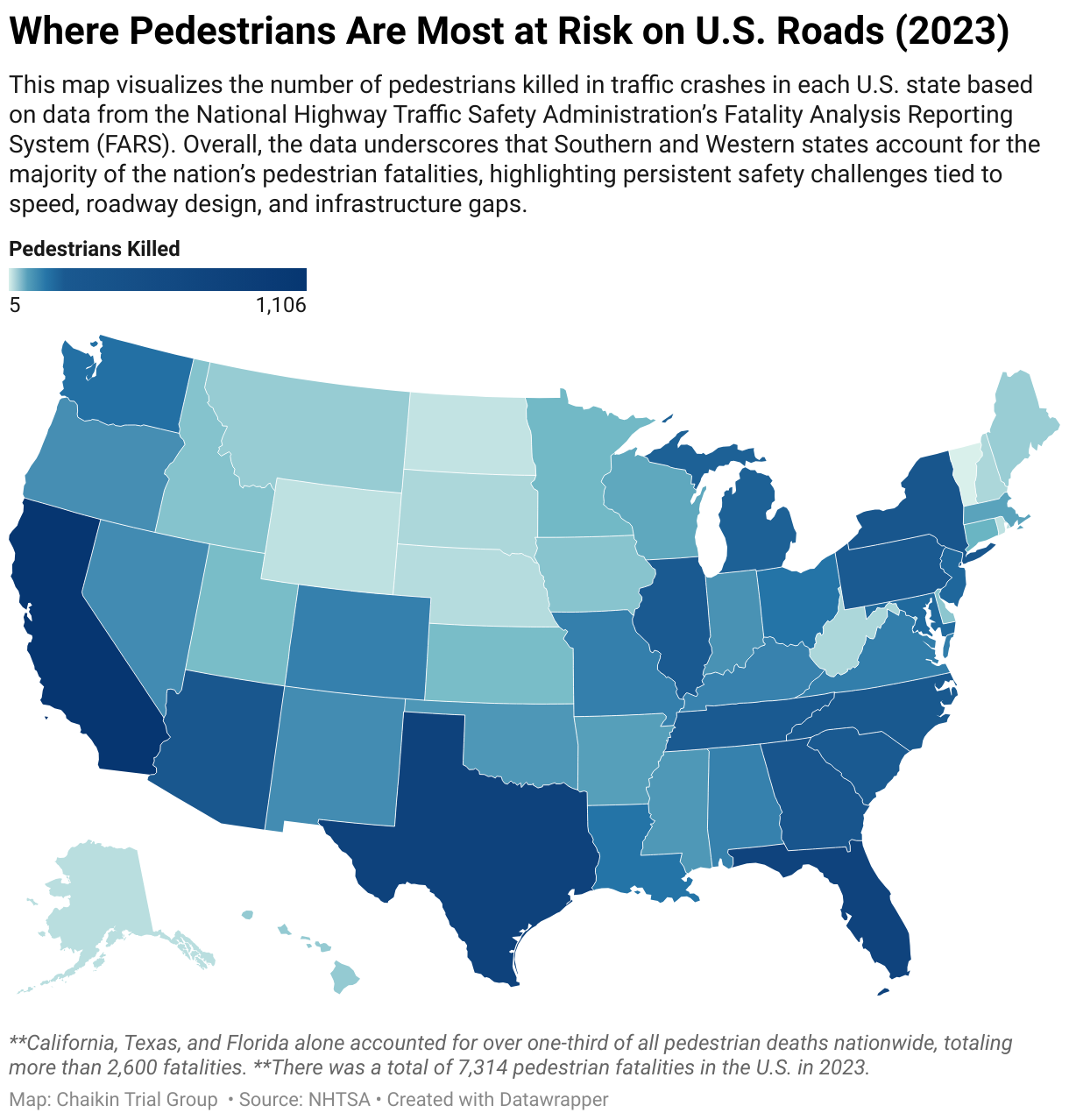 This map visualizes the number of pedestrians killed in traffic crashes in each U.S. state based on data from the National Highway Traffic Safety Administration’s Fatality Analysis Reporting System (FARS). Overall, the data underscores that Southern and Western states account for the majority of the nation’s pedestrian fatalities, highlighting persistent safety challenges tied to speed, roadway design, and infrastructure gaps.