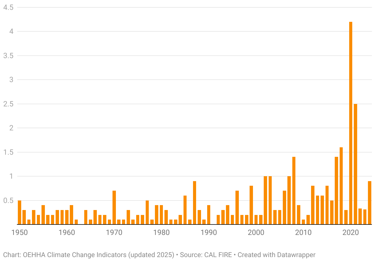 This graph shows the number of acres burned by wildfires in California each year. An exceptionally high number of acres burned in 2020 and 2021.