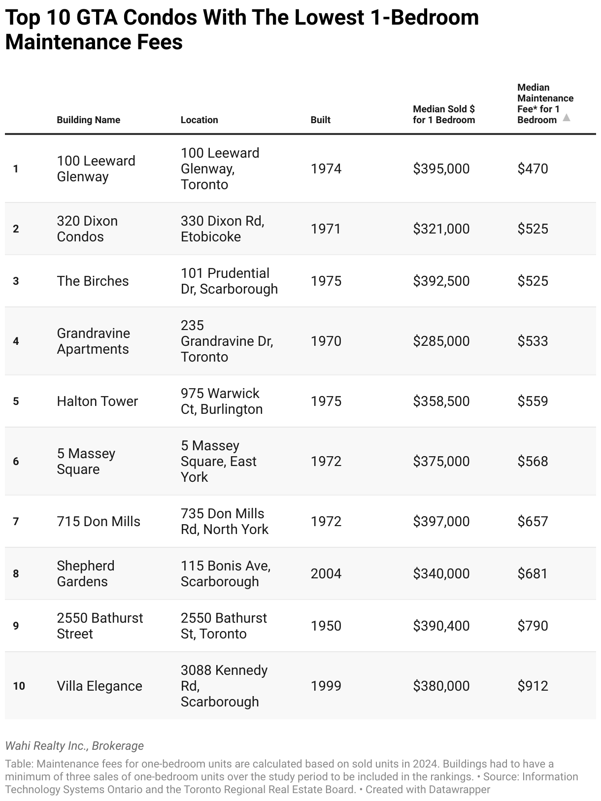 Top 10 GTA Condos With The Lowest 1-Bedroom Maintenance Fees