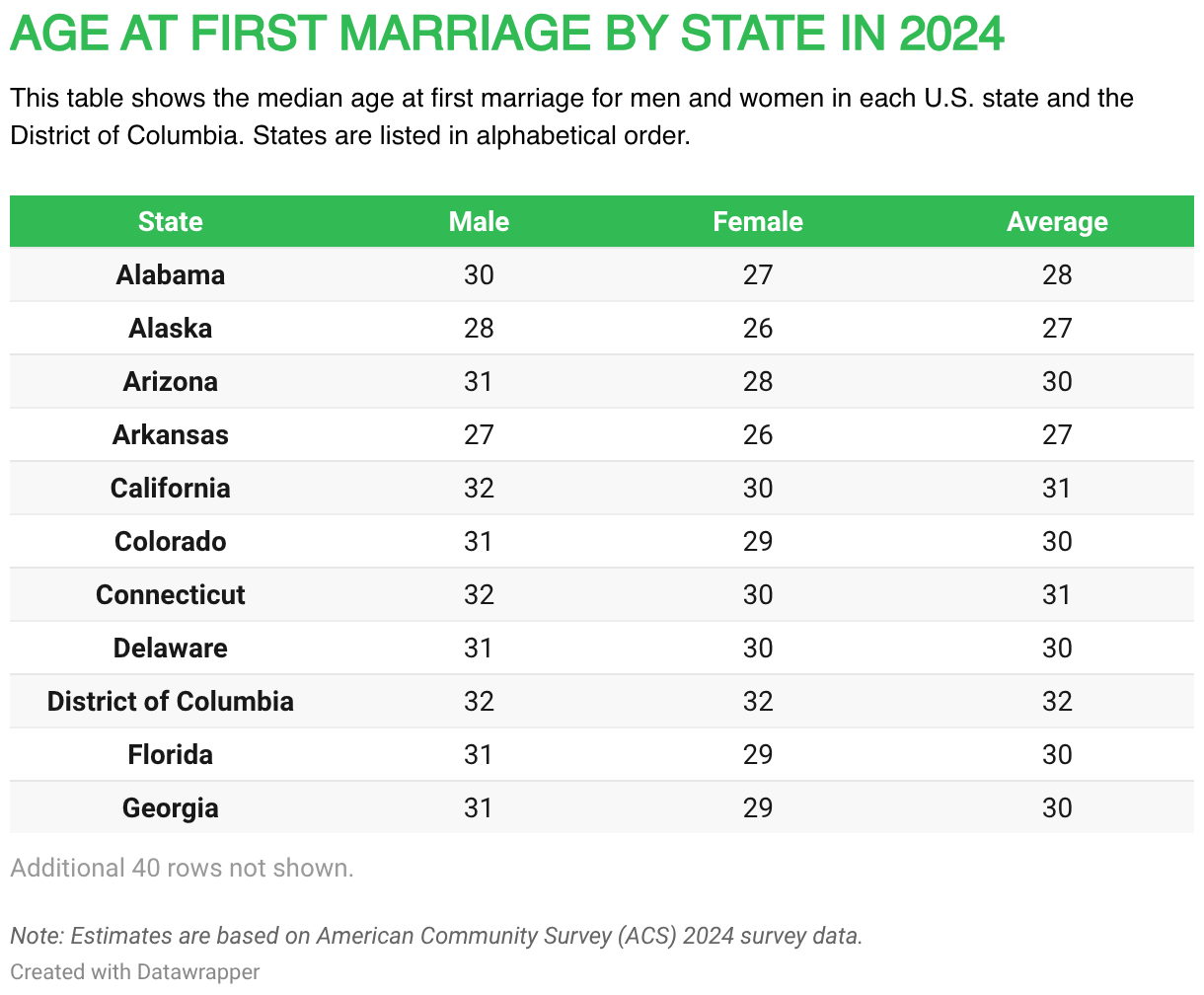This table shows the median age at first marriage for men and women in each U.S. state and the District of Columbia. States are listed in alphabetical order.