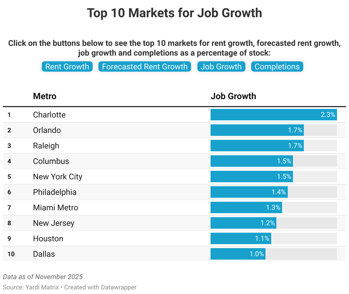 Click on the buttons below to see the top 10 markets for rent growth, forecasted rent growth, job growth and completions as a percentage of stock: