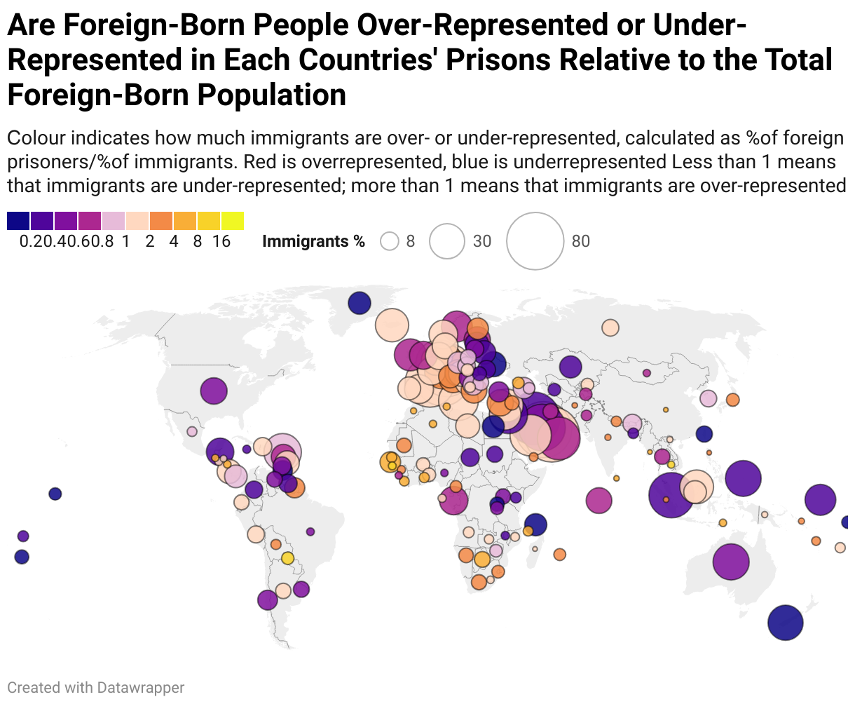 Сolour indicates how much immigrants are over- or under-represented, calculated as %of foreign prisoners/%of immigrants. Red is overrepresented, blue is underrepresented Less than 1 means that immigrants are under-represented; more than 1 means that immigrants are over-represented