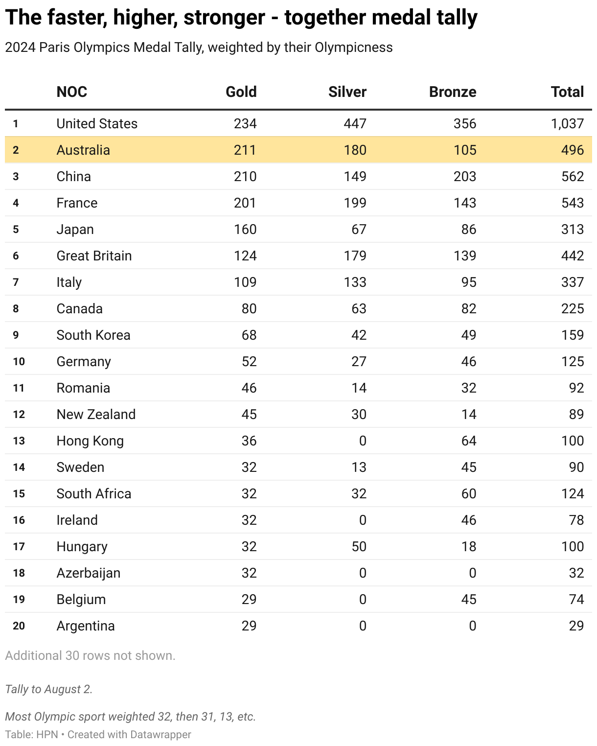 2024 Paris Olympics Medal Tally, weighted by their Olympicness