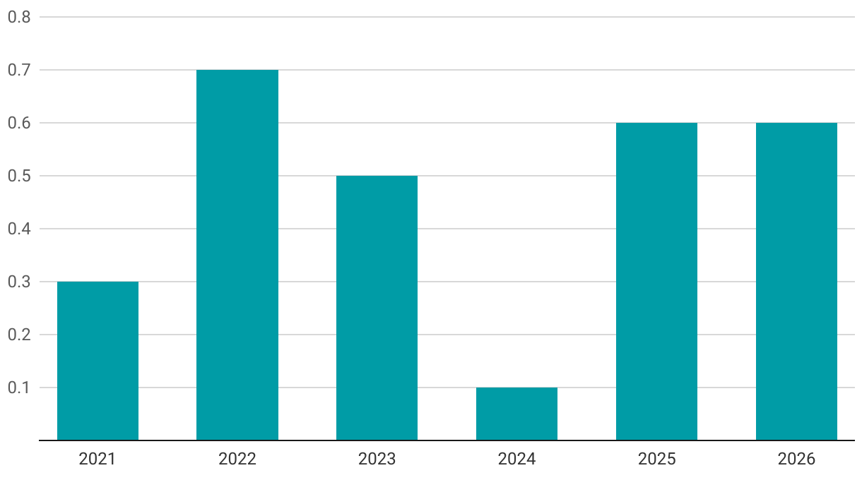 The bar chart shows the estimated yearly contribution to GDP growth, measured in percentage points (pps), from 2021 to 2026.