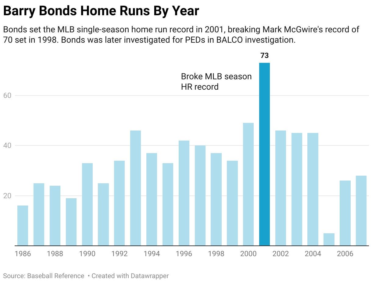 Bonds set the MLB single-season home run record in 2001, breaking Mark McGwire's record of 70 set in 1998. Bonds was later investigated for PEDs in BALCO investigation.